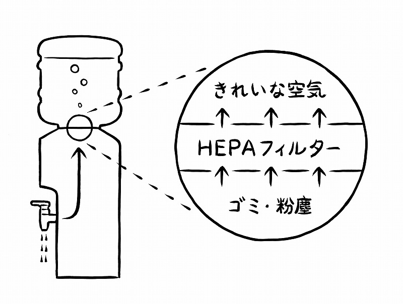 使うたびにボトル内にボコボコッと入る空気は、HEPAフィルターを通してゴミ・粉塵が徹底的に除去されています。