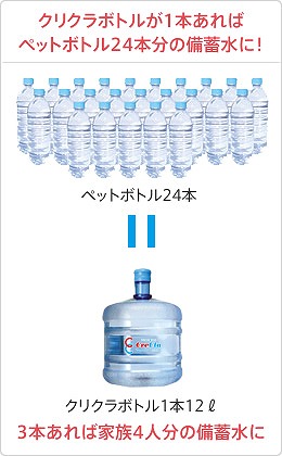 防災にもクリクラ 投稿者:creclatsukumo2021年5月31日カテゴリー:未分類 1日に1人が使用する水は約3リットル。クリクラの水なら1ボトル12リットルです。4人家族でもボトル3本あれば3日分のお水が確保できます。また、サーバーは停電時でもご使用できる設計になっております。 共有: X で共有 (新しいウィンドウで開きます) X Facebook で共有 (新しいウィンドウで開きます) Facebook いいね 読み込み中… 関連