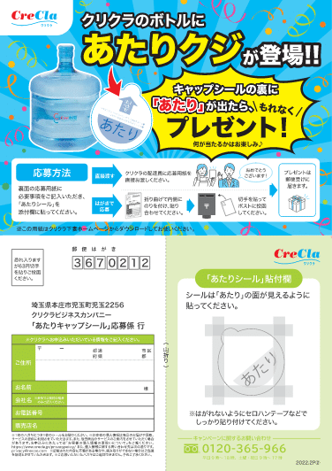 クリクラ配送時に配送員から応募用紙を配布いたします。「あたりシール」を応募用紙の添付欄に貼り、